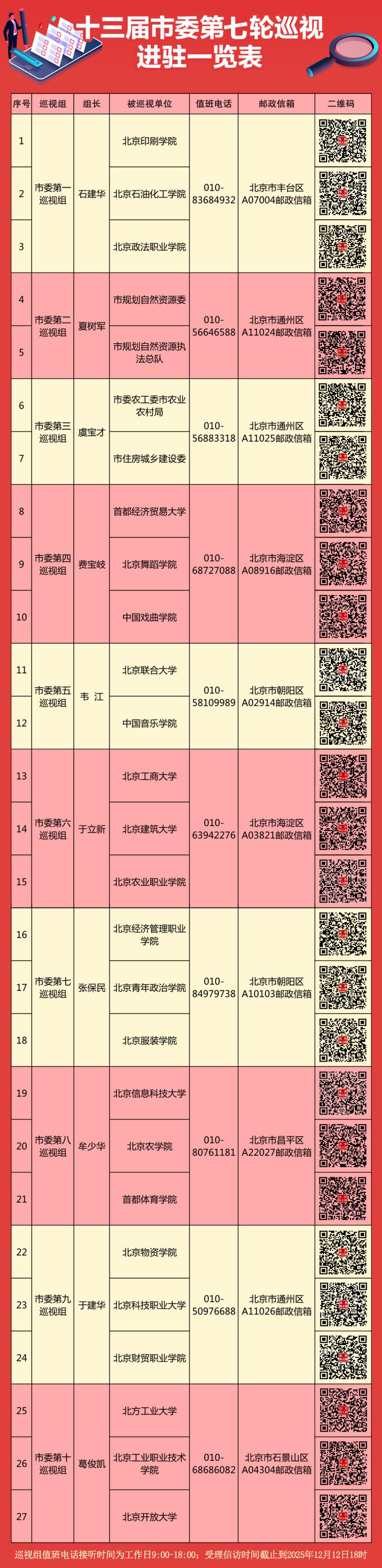 据了解,10个市委巡视组将在被巡视单位工作2个月左右,期间设立专门值班电话、邮政信箱和信访二维码,主要受理被巡视党组织领导班子及其成员、市委管理的其他干部及下一级党组织领导班子主要负责人、重要岗位领导干部问题的来信来电来访,重点是违反政治纪律、组织纪律、廉洁纪律、群众纪律、工作纪律和生活纪律等方面的举报和反映。其他不属于巡视受理范围的信访问题将按照规定转有关部门处理。巡视组受理信访时间截止到2025年12月12日。